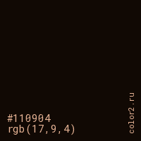 Цвет #110904 в цветовой модели RGB обозначается тремя октетами (17, 9, 4) в десятичном формате и #110904 в шестнадцатиричном (hex) формате, которые являются интенсивностью красного 17 (hex 11), интенсивность зелёного 9 (hex 09) и интенсивность синего 4 (hex 04).