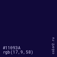 Цвет #11093A в цветовой модели RGB обозначается тремя октетами (17, 9, 58) в десятичном формате и #11093A в шестнадцатиричном (hex) формате, которые являются интенсивностью красного 17 (hex 11), интенсивность зелёного 9 (hex 09) и интенсивность синего 58 (hex 3A).