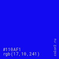 Цвет #110AF1 в цветовой модели RGB обозначается тремя октетами (17, 10, 241) в десятичном формате и #110AF1 в шестнадцатиричном (hex) формате, которые являются интенсивностью красного 17 (hex 11), интенсивность зелёного 10 (hex 0A) и интенсивность синего 241 (hex F1).