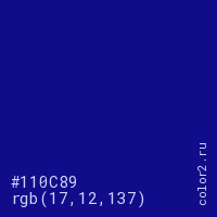 Цвет #110C89 в цветовой модели RGB обозначается тремя октетами (17, 12, 137) в десятичном формате и #110C89 в шестнадцатиричном (hex) формате, которые являются интенсивностью красного 17 (hex 11), интенсивность зелёного 12 (hex 0C) и интенсивность синего 137 (hex 89).