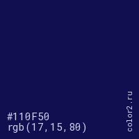 Цвет #110F50 в цветовой модели RGB обозначается тремя октетами (17, 15, 80) в десятичном формате и #110F50 в шестнадцатиричном (hex) формате, которые являются интенсивностью красного 17 (hex 11), интенсивность зелёного 15 (hex 0F) и интенсивность синего 80 (hex 50).