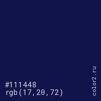 Цвет #111448 в цветовой модели RGB обозначается тремя октетами (17, 20, 72) в десятичном формате и #111448 в шестнадцатиричном (hex) формате, которые являются интенсивностью красного 17 (hex 11), интенсивность зелёного 20 (hex 14) и интенсивность синего 72 (hex 48).
