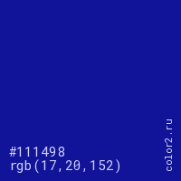 Цвет #111498 в цветовой модели RGB обозначается тремя октетами (17, 20, 152) в десятичном формате и #111498 в шестнадцатиричном (hex) формате, которые являются интенсивностью красного 17 (hex 11), интенсивность зелёного 20 (hex 14) и интенсивность синего 152 (hex 98).