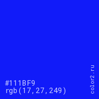 Цвет #111BF9 в цветовой модели RGB обозначается тремя октетами (17, 27, 249) в десятичном формате и #111BF9 в шестнадцатиричном (hex) формате, которые являются интенсивностью красного 17 (hex 11), интенсивность зелёного 27 (hex 1B) и интенсивность синего 249 (hex F9).