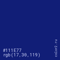 Цвет #111E77 в цветовой модели RGB обозначается тремя октетами (17, 30, 119) в десятичном формате и #111E77 в шестнадцатиричном (hex) формате, которые являются интенсивностью красного 17 (hex 11), интенсивность зелёного 30 (hex 1E) и интенсивность синего 119 (hex 77).