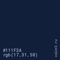 Цвет #111F3A в цветовой модели RGB обозначается тремя октетами (17, 31, 58) в десятичном формате и #111F3A в шестнадцатиричном (hex) формате, которые являются интенсивностью красного 17 (hex 11), интенсивность зелёного 31 (hex 1F) и интенсивность синего 58 (hex 3A).