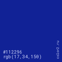 Цвет #112296 в цветовой модели RGB обозначается тремя октетами (17, 34, 150) в десятичном формате и #112296 в шестнадцатиричном (hex) формате, которые являются интенсивностью красного 17 (hex 11), интенсивность зелёного 34 (hex 22) и интенсивность синего 150 (hex 96).