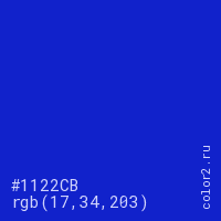 Цвет #1122CB в цветовой модели RGB обозначается тремя октетами (17, 34, 203) в десятичном формате и #1122CB в шестнадцатиричном (hex) формате, которые являются интенсивностью красного 17 (hex 11), интенсивность зелёного 34 (hex 22) и интенсивность синего 203 (hex CB).