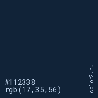 Цвет #112338 в цветовой модели RGB обозначается тремя октетами (17, 35, 56) в десятичном формате и #112338 в шестнадцатиричном (hex) формате, которые являются интенсивностью красного 17 (hex 11), интенсивность зелёного 35 (hex 23) и интенсивность синего 56 (hex 38).