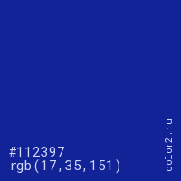 Цвет #112397 в цветовой модели RGB обозначается тремя октетами (17, 35, 151) в десятичном формате и #112397 в шестнадцатиричном (hex) формате, которые являются интенсивностью красного 17 (hex 11), интенсивность зелёного 35 (hex 23) и интенсивность синего 151 (hex 97).