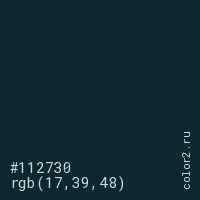 Цвет #112730 в цветовой модели RGB обозначается тремя октетами (17, 39, 48) в десятичном формате и #112730 в шестнадцатиричном (hex) формате, которые являются интенсивностью красного 17 (hex 11), интенсивность зелёного 39 (hex 27) и интенсивность синего 48 (hex 30).
