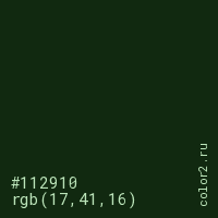 Цвет #112910 в цветовой модели RGB обозначается тремя октетами (17, 41, 16) в десятичном формате и #112910 в шестнадцатиричном (hex) формате, которые являются интенсивностью красного 17 (hex 11), интенсивность зелёного 41 (hex 29) и интенсивность синего 16 (hex 10).