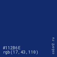 Цвет #112B6E в цветовой модели RGB обозначается тремя октетами (17, 43, 110) в десятичном формате и #112B6E в шестнадцатиричном (hex) формате, которые являются интенсивностью красного 17 (hex 11), интенсивность зелёного 43 (hex 2B) и интенсивность синего 110 (hex 6E).
