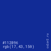 Цвет #112B96 в цветовой модели RGB обозначается тремя октетами (17, 43, 150) в десятичном формате и #112B96 в шестнадцатиричном (hex) формате, которые являются интенсивностью красного 17 (hex 11), интенсивность зелёного 43 (hex 2B) и интенсивность синего 150 (hex 96).