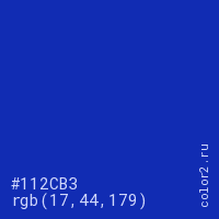 Цвет #112CB3 в цветовой модели RGB обозначается тремя октетами (17, 44, 179) в десятичном формате и #112CB3 в шестнадцатиричном (hex) формате, которые являются интенсивностью красного 17 (hex 11), интенсивность зелёного 44 (hex 2C) и интенсивность синего 179 (hex B3).