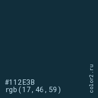 Цвет #112E3B в цветовой модели RGB обозначается тремя октетами (17, 46, 59) в десятичном формате и #112E3B в шестнадцатиричном (hex) формате, которые являются интенсивностью красного 17 (hex 11), интенсивность зелёного 46 (hex 2E) и интенсивность синего 59 (hex 3B).