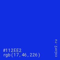 Цвет #112EE2 в цветовой модели RGB обозначается тремя октетами (17, 46, 226) в десятичном формате и #112EE2 в шестнадцатиричном (hex) формате, которые являются интенсивностью красного 17 (hex 11), интенсивность зелёного 46 (hex 2E) и интенсивность синего 226 (hex E2).