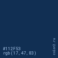 Цвет #112F53 в цветовой модели RGB обозначается тремя октетами (17, 47, 83) в десятичном формате и #112F53 в шестнадцатиричном (hex) формате, которые являются интенсивностью красного 17 (hex 11), интенсивность зелёного 47 (hex 2F) и интенсивность синего 83 (hex 53).