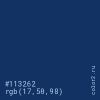 Цвет #113262 в цветовой модели RGB обозначается тремя октетами (17, 50, 98) в десятичном формате и #113262 в шестнадцатиричном (hex) формате, которые являются интенсивностью красного 17 (hex 11), интенсивность зелёного 50 (hex 32) и интенсивность синего 98 (hex 62).