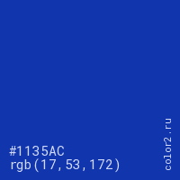 Цвет #1135AC в цветовой модели RGB обозначается тремя октетами (17, 53, 172) в десятичном формате и #1135AC в шестнадцатиричном (hex) формате, которые являются интенсивностью красного 17 (hex 11), интенсивность зелёного 53 (hex 35) и интенсивность синего 172 (hex AC).