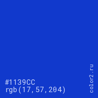 Цвет #1139CC в цветовой модели RGB обозначается тремя октетами (17, 57, 204) в десятичном формате и #1139CC в шестнадцатиричном (hex) формате, которые являются интенсивностью красного 17 (hex 11), интенсивность зелёного 57 (hex 39) и интенсивность синего 204 (hex CC).