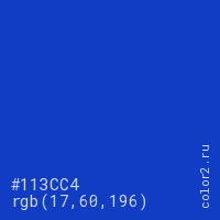 Цвет #113CC4 в цветовой модели RGB обозначается тремя октетами (17, 60, 196) в десятичном формате и #113CC4 в шестнадцатиричном (hex) формате, которые являются интенсивностью красного 17 (hex 11), интенсивность зелёного 60 (hex 3C) и интенсивность синего 196 (hex C4).