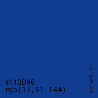 Цвет #113D90 в цветовой модели RGB обозначается тремя октетами (17, 61, 144) в десятичном формате и #113D90 в шестнадцатиричном (hex) формате, которые являются интенсивностью красного 17 (hex 11), интенсивность зелёного 61 (hex 3D) и интенсивность синего 144 (hex 90).