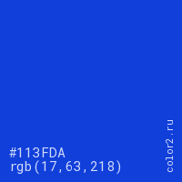 Цвет #113FDA в цветовой модели RGB обозначается тремя октетами (17, 63, 218) в десятичном формате и #113FDA в шестнадцатиричном (hex) формате, которые являются интенсивностью красного 17 (hex 11), интенсивность зелёного 63 (hex 3F) и интенсивность синего 218 (hex DA).