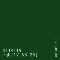 Цвет #114119 в цветовой модели RGB обозначается тремя октетами (17, 65, 25) в десятичном формате и #114119 в шестнадцатиричном (hex) формате, которые являются интенсивностью красного 17 (hex 11), интенсивность зелёного 65 (hex 41) и интенсивность синего 25 (hex 19).