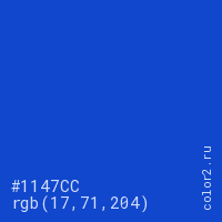 Цвет #1147CC в цветовой модели RGB обозначается тремя октетами (17, 71, 204) в десятичном формате и #1147CC в шестнадцатиричном (hex) формате, которые являются интенсивностью красного 17 (hex 11), интенсивность зелёного 71 (hex 47) и интенсивность синего 204 (hex CC).