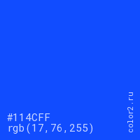 Цвет #114CFF в цветовой модели RGB обозначается тремя октетами (17, 76, 255) в десятичном формате и #114CFF в шестнадцатиричном (hex) формате, которые являются интенсивностью красного 17 (hex 11), интенсивность зелёного 76 (hex 4C) и интенсивность синего 255 (hex FF).