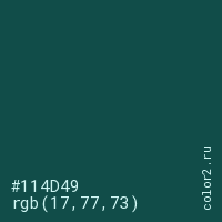 Цвет #114D49 в цветовой модели RGB обозначается тремя октетами (17, 77, 73) в десятичном формате и #114D49 в шестнадцатиричном (hex) формате, которые являются интенсивностью красного 17 (hex 11), интенсивность зелёного 77 (hex 4D) и интенсивность синего 73 (hex 49).