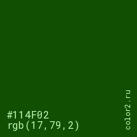 Цвет #114F02 в цветовой модели RGB обозначается тремя октетами (17, 79, 2) в десятичном формате и #114F02 в шестнадцатиричном (hex) формате, которые являются интенсивностью красного 17 (hex 11), интенсивность зелёного 79 (hex 4F) и интенсивность синего 2 (hex 02).