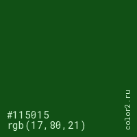 Цвет #115015 в цветовой модели RGB обозначается тремя октетами (17, 80, 21) в десятичном формате и #115015 в шестнадцатиричном (hex) формате, которые являются интенсивностью красного 17 (hex 11), интенсивность зелёного 80 (hex 50) и интенсивность синего 21 (hex 15).