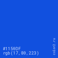 Цвет #1150DF в цветовой модели RGB обозначается тремя октетами (17, 80, 223) в десятичном формате и #1150DF в шестнадцатиричном (hex) формате, которые являются интенсивностью красного 17 (hex 11), интенсивность зелёного 80 (hex 50) и интенсивность синего 223 (hex DF).