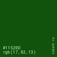 Цвет #11520D в цветовой модели RGB обозначается тремя октетами (17, 82, 13) в десятичном формате и #11520D в шестнадцатиричном (hex) формате, которые являются интенсивностью красного 17 (hex 11), интенсивность зелёного 82 (hex 52) и интенсивность синего 13 (hex 0D).
