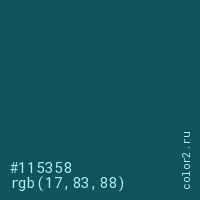 Цвет #115358 в цветовой модели RGB обозначается тремя октетами (17, 83, 88) в десятичном формате и #115358 в шестнадцатиричном (hex) формате, которые являются интенсивностью красного 17 (hex 11), интенсивность зелёного 83 (hex 53) и интенсивность синего 88 (hex 58).