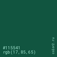 Цвет #115541 в цветовой модели RGB обозначается тремя октетами (17, 85, 65) в десятичном формате и #115541 в шестнадцатиричном (hex) формате, которые являются интенсивностью красного 17 (hex 11), интенсивность зелёного 85 (hex 55) и интенсивность синего 65 (hex 41).
