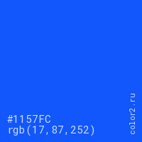 Цвет #1157FC в цветовой модели RGB обозначается тремя октетами (17, 87, 252) в десятичном формате и #1157FC в шестнадцатиричном (hex) формате, которые являются интенсивностью красного 17 (hex 11), интенсивность зелёного 87 (hex 57) и интенсивность синего 252 (hex FC).
