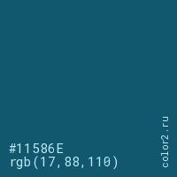 Цвет #11586E в цветовой модели RGB обозначается тремя октетами (17, 88, 110) в десятичном формате и #11586E в шестнадцатиричном (hex) формате, которые являются интенсивностью красного 17 (hex 11), интенсивность зелёного 88 (hex 58) и интенсивность синего 110 (hex 6E).