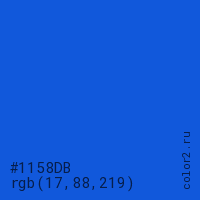 Цвет #1158DB в цветовой модели RGB обозначается тремя октетами (17, 88, 219) в десятичном формате и #1158DB в шестнадцатиричном (hex) формате, которые являются интенсивностью красного 17 (hex 11), интенсивность зелёного 88 (hex 58) и интенсивность синего 219 (hex DB).