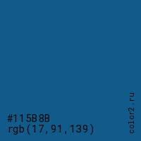 Цвет #115B8B в цветовой модели RGB обозначается тремя октетами (17, 91, 139) в десятичном формате и #115B8B в шестнадцатиричном (hex) формате, которые являются интенсивностью красного 17 (hex 11), интенсивность зелёного 91 (hex 5B) и интенсивность синего 139 (hex 8B).