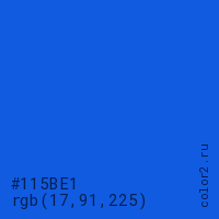 Цвет #115BE1 в цветовой модели RGB обозначается тремя октетами (17, 91, 225) в десятичном формате и #115BE1 в шестнадцатиричном (hex) формате, которые являются интенсивностью красного 17 (hex 11), интенсивность зелёного 91 (hex 5B) и интенсивность синего 225 (hex E1).