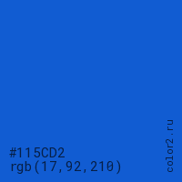 Цвет #115CD2 в цветовой модели RGB обозначается тремя октетами (17, 92, 210) в десятичном формате и #115CD2 в шестнадцатиричном (hex) формате, которые являются интенсивностью красного 17 (hex 11), интенсивность зелёного 92 (hex 5C) и интенсивность синего 210 (hex D2).