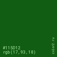 Цвет #115D12 в цветовой модели RGB обозначается тремя октетами (17, 93, 18) в десятичном формате и #115D12 в шестнадцатиричном (hex) формате, которые являются интенсивностью красного 17 (hex 11), интенсивность зелёного 93 (hex 5D) и интенсивность синего 18 (hex 12).