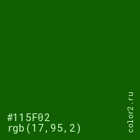 Цвет #115F02 в цветовой модели RGB обозначается тремя октетами (17, 95, 2) в десятичном формате и #115F02 в шестнадцатиричном (hex) формате, которые являются интенсивностью красного 17 (hex 11), интенсивность зелёного 95 (hex 5F) и интенсивность синего 2 (hex 02).
