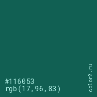 Цвет #116053 в цветовой модели RGB обозначается тремя октетами (17, 96, 83) в десятичном формате и #116053 в шестнадцатиричном (hex) формате, которые являются интенсивностью красного 17 (hex 11), интенсивность зелёного 96 (hex 60) и интенсивность синего 83 (hex 53).