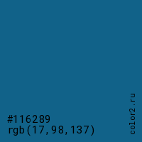 Цвет #116289 в цветовой модели RGB обозначается тремя октетами (17, 98, 137) в десятичном формате и #116289 в шестнадцатиричном (hex) формате, которые являются интенсивностью красного 17 (hex 11), интенсивность зелёного 98 (hex 62) и интенсивность синего 137 (hex 89).