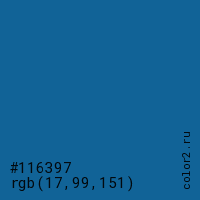 Цвет #116397 в цветовой модели RGB обозначается тремя октетами (17, 99, 151) в десятичном формате и #116397 в шестнадцатиричном (hex) формате, которые являются интенсивностью красного 17 (hex 11), интенсивность зелёного 99 (hex 63) и интенсивность синего 151 (hex 97).