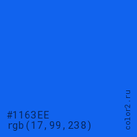 Цвет #1163EE в цветовой модели RGB обозначается тремя октетами (17, 99, 238) в десятичном формате и #1163EE в шестнадцатиричном (hex) формате, которые являются интенсивностью красного 17 (hex 11), интенсивность зелёного 99 (hex 63) и интенсивность синего 238 (hex EE).